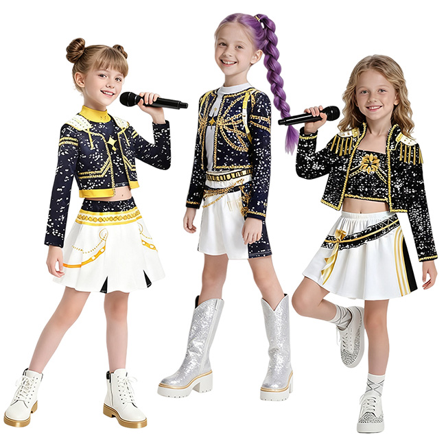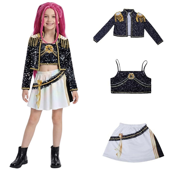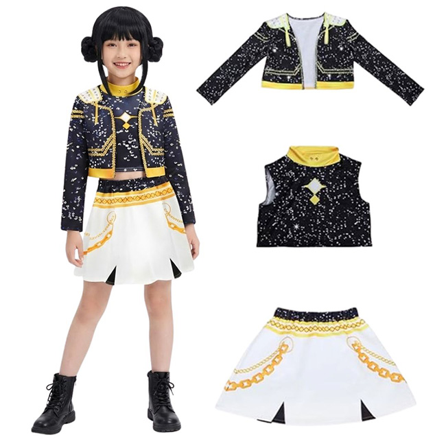 Костюмът на Zoey (Зоуи) е свеж и артистичен, точно като самата героиня, с черен блейзър, обкантен в златно и принт пайети. Той е ярък с поп детайли. Полата е бяла със златни елементи, а топа, който се носи под блейзъра отново черен, с полу поло около врата в златисто. Изключителна комбинация! Идеален избор за момичета, които обичат да се отличават на сцената и да танцуват като истинска K-pop звезда.