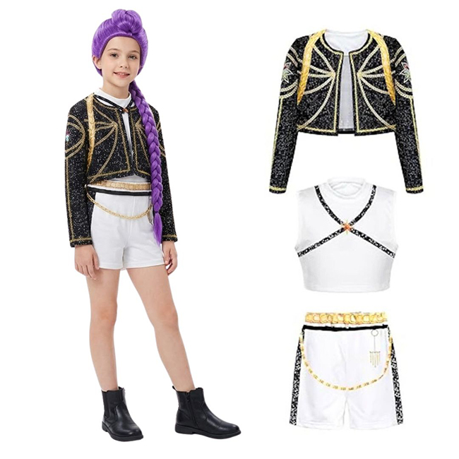 Страхотният костюм, вдъхновен от героините от K-pop групата Huntr/x, е най-предпочитаният сред момичетата, които обичат музика, танци и сценични игри. Той придава визуално стил, блясък и модерно сценично излъчване, а в игрите и представленията на малките фенки на Kpop Demon Hunters това е ключово.