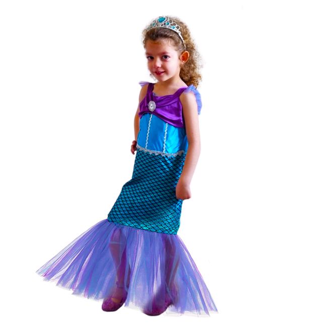 Тази чудесна комбинация от дългата рокля Ариел, която завършва долу с шлейф, който имитира перката й, заедно с аксесоарите за принцеси е предпочитана от момиченцата за игра всеки ден.