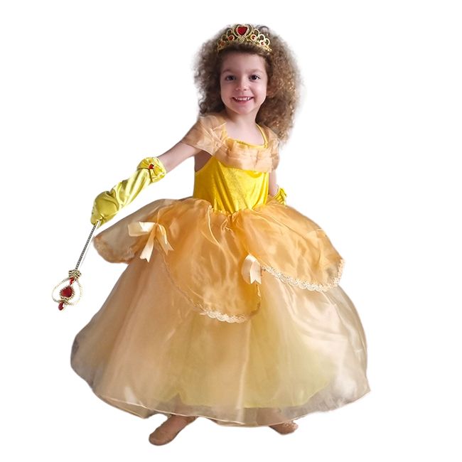 Този костюм на Красавицата от познатото филмче, с елегантна дълга рокля, с къс буфан ръкав и бюстие, в едно със златните аксесоари е просто разкошен.